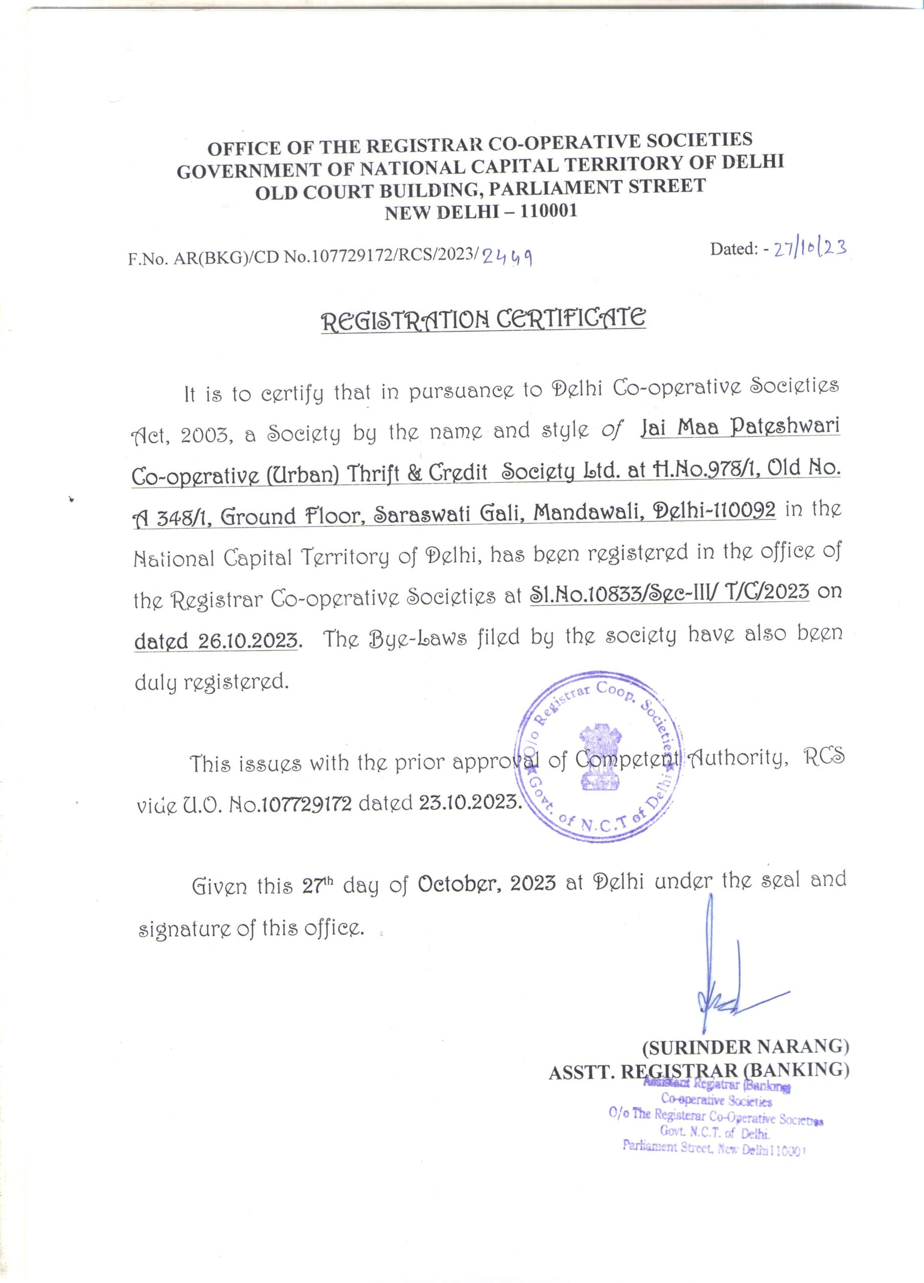Jai Maa Pateshwari Co-operative (Urban) Thrift & Credit Society Ltd. is a Thrift & Credit Cooperative Society registered under the Delhi Cooperative Societies Act 2003 vide registration number 10833. The main goal of establishing this co-operative society is to promote financial freedom among people around us.